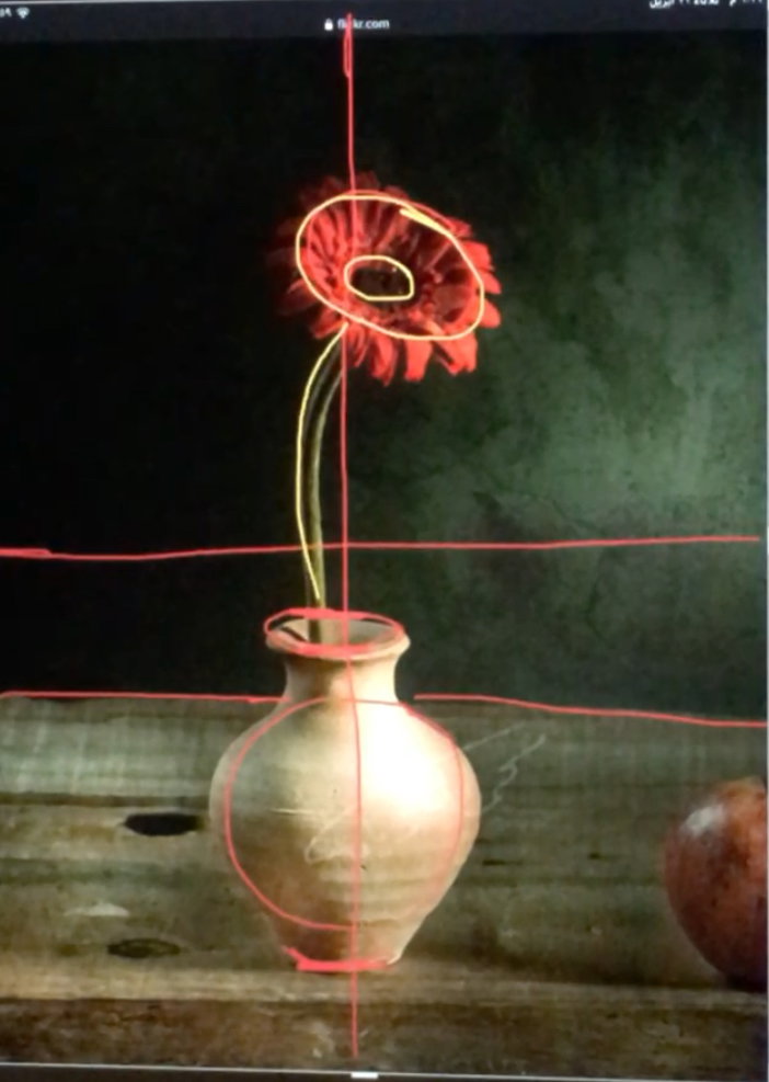 كذلك الخلفية داكنة مقارنة بالطاولة، وبعض بتلات الوردة في الصورة الأصلية متقاربة من لون الخلفية من حين أماكن الظلال، لذا ستكون مقاربة أثناء الرسم.